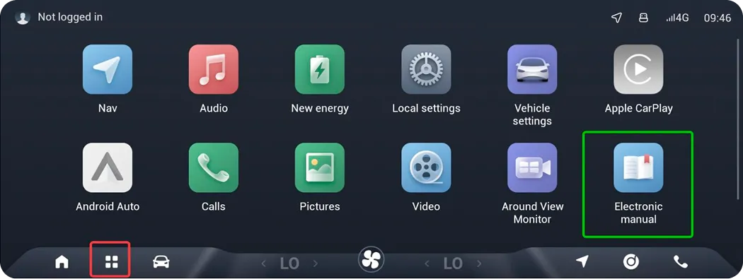 Norėdami pasiekti transporto priemonės naudotojo vadovą: pirmiausia spustelėkite raudoną langelį, tada žalią langelį – čia yra naudotojo vadovas.